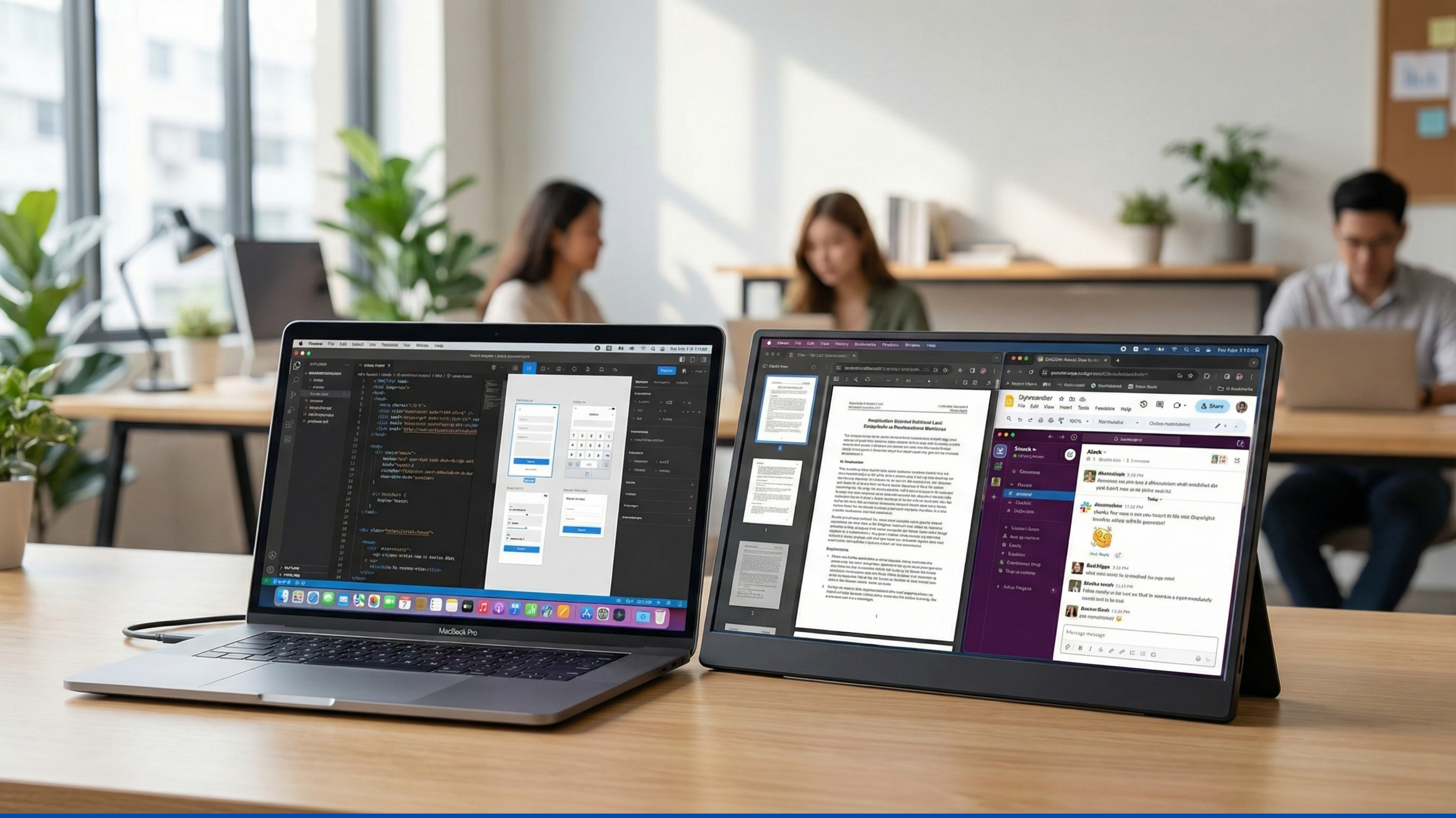DualView™ Flex est le seul moniteur portable dont tu as besoin. Travail le jour. Gaming le soir. Vrai 144Hz, 4K, compatible Mac, PC, PS5, Xbox. Pas de compromis.